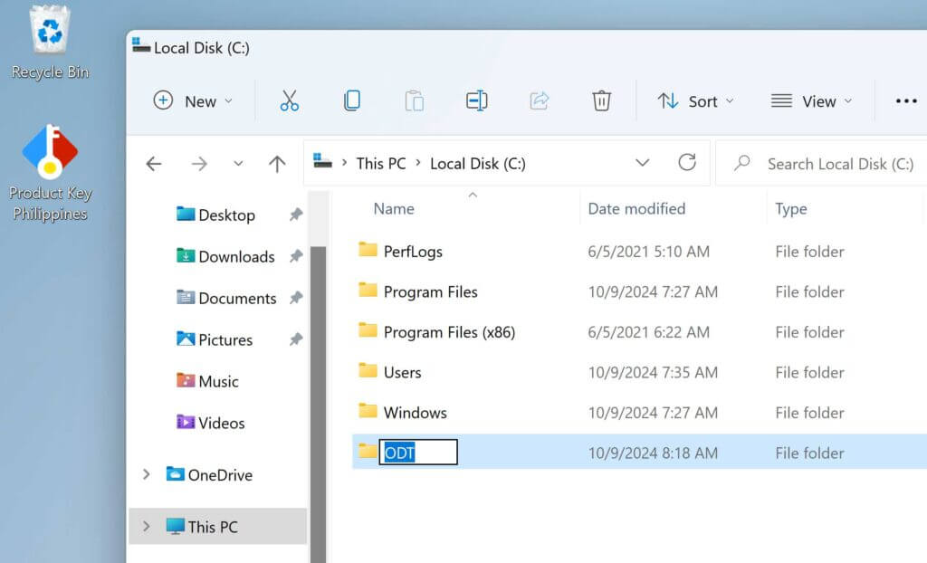 - Cree una carpeta en su disco duro y llámela ODT. Para este ejemplo, la crearemos en la unidad c:\, así: c:\ODT.